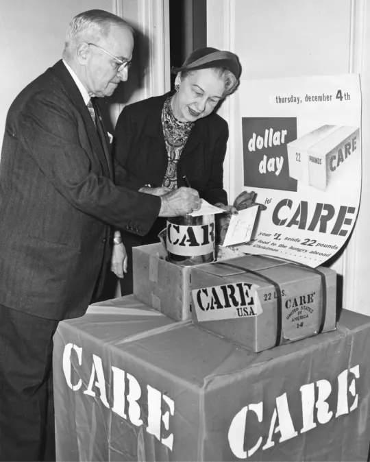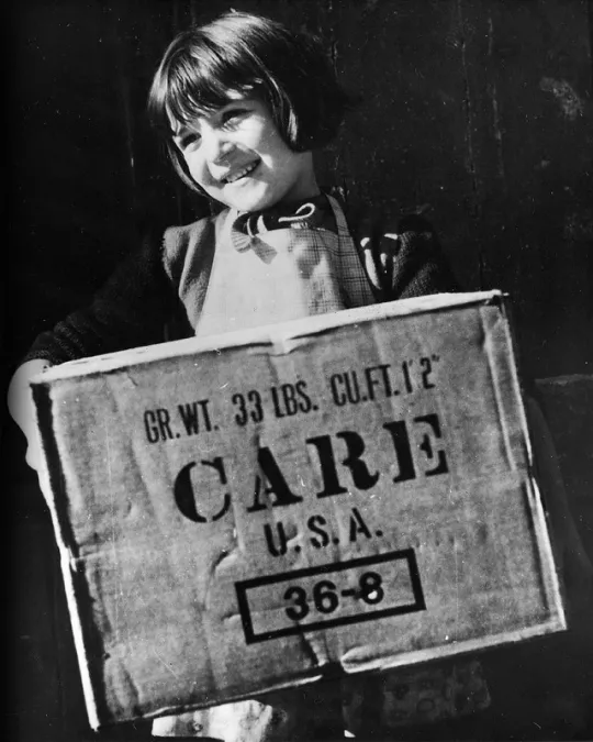 At the end of World War II, with much of the world in ruins, Arthur Ringland and Dr. Lincoln Clark approach 22 American charities to propose a non-profit corporation to funnel food packages from Americans to loved ones in Europe. The charities agree and on November 27, they incorporate the Cooperative for American Remittances to Europe (CARE). After negotiation with multiple government agencies, CARE takes possession of 2.8 million “10-in-1” military food rations. These rations become the world’s first CARE PACKAGE and an American symbol is born.
