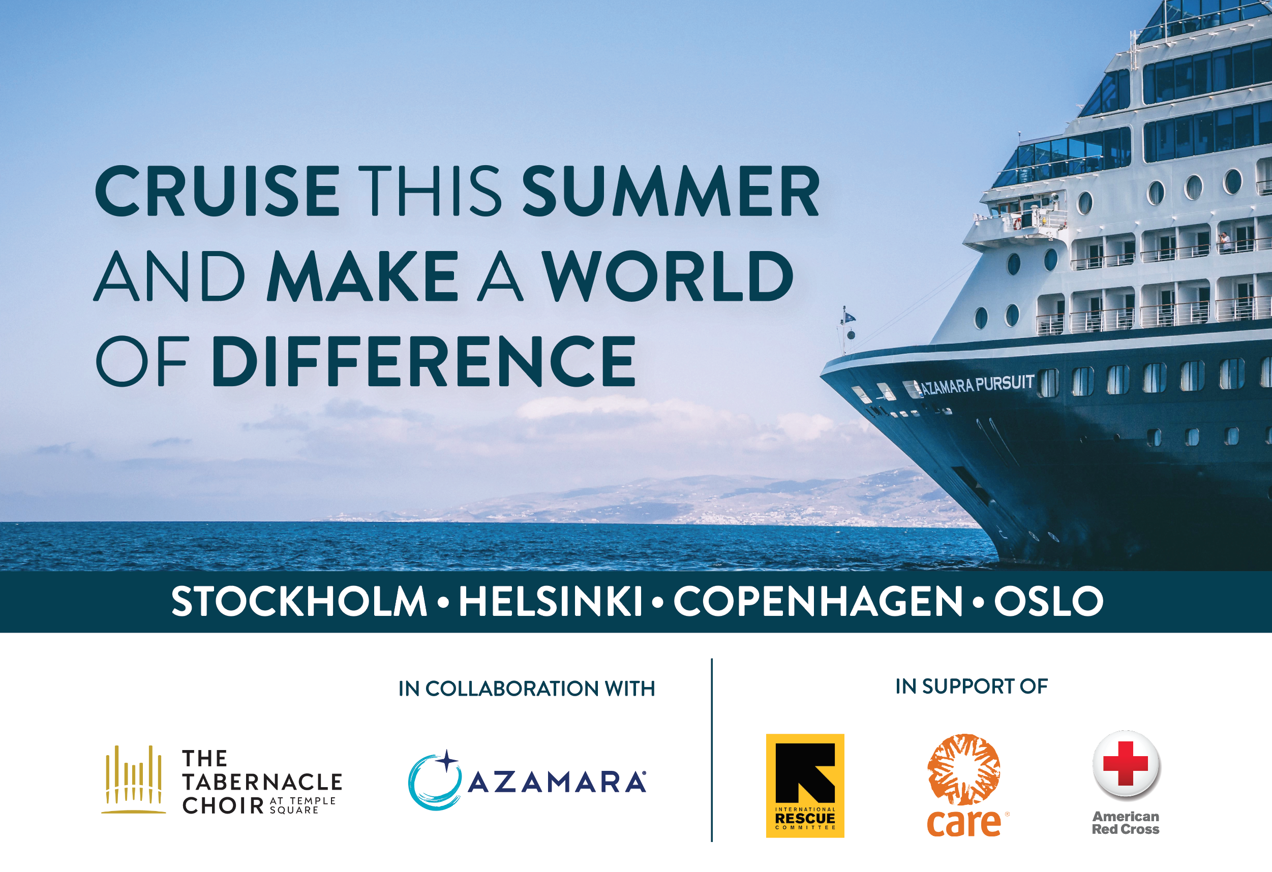 “We are pleased to use this opportunity to honor the sacred directive to love our neighbors,” said Mike Leavitt, President of The Tabernacle Choir. “We are enormously grateful to be able to assist CARE, the International Rescue Committee, and the American Red Cross in bringing much-needed aid to those suffering worldwide and express our sincere thanks to Azamara for working with us to create this charitable cruise opportunity.”