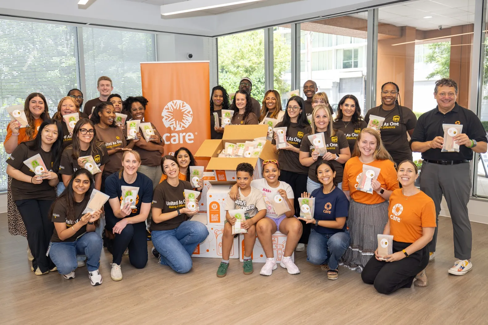 Atlanta, Georgia, July 24, 2025 – The Atlanta-based humanitarian organization CARE is partnering with The UPS Foundation to prepare for the peak of hurricane season. Earlier today, dozens of UPS employee volunteers gathered at CARE’s headquarters in Downtown Atlanta to pack 1,000 disaster response CARE PACKAGE® boxes that will be distributed to individuals and families impacted by disasters in the US.