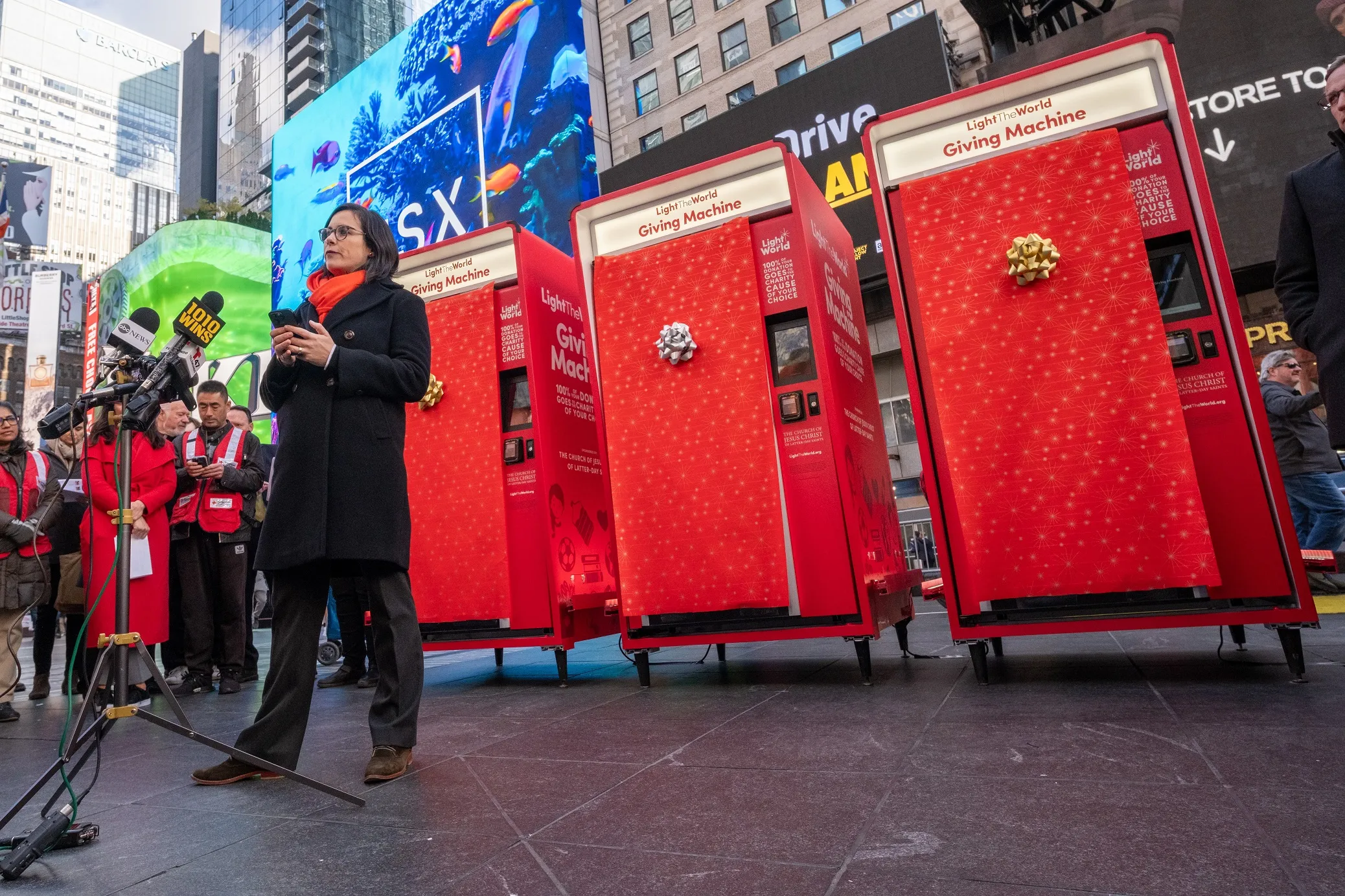 New York (November 28, 2023) — On the eve of Giving Tuesday, Light the World Giving Machines returned to NYC with a community kick off event and official “unwrapping” in Times Square. The Light the World Giving Machines, inaugurated in 2017, are a charitable initiative of the Church of Jesus Christ of Latter-day Saints, creating a way to provide help to others in local communities around the world and during the holiday season.