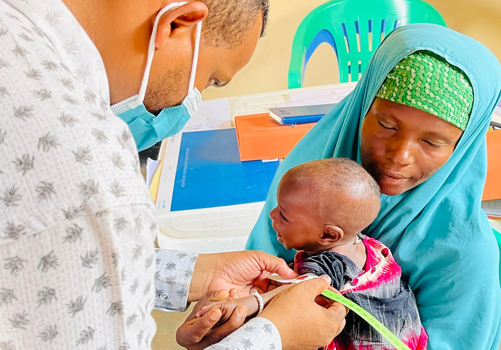 A mother holds her 7-month old daughter as Health Officer Abdikadir Abukar measures his Mid-Upper Arm Circumference (MUAC) at Kismayo Health Centre.