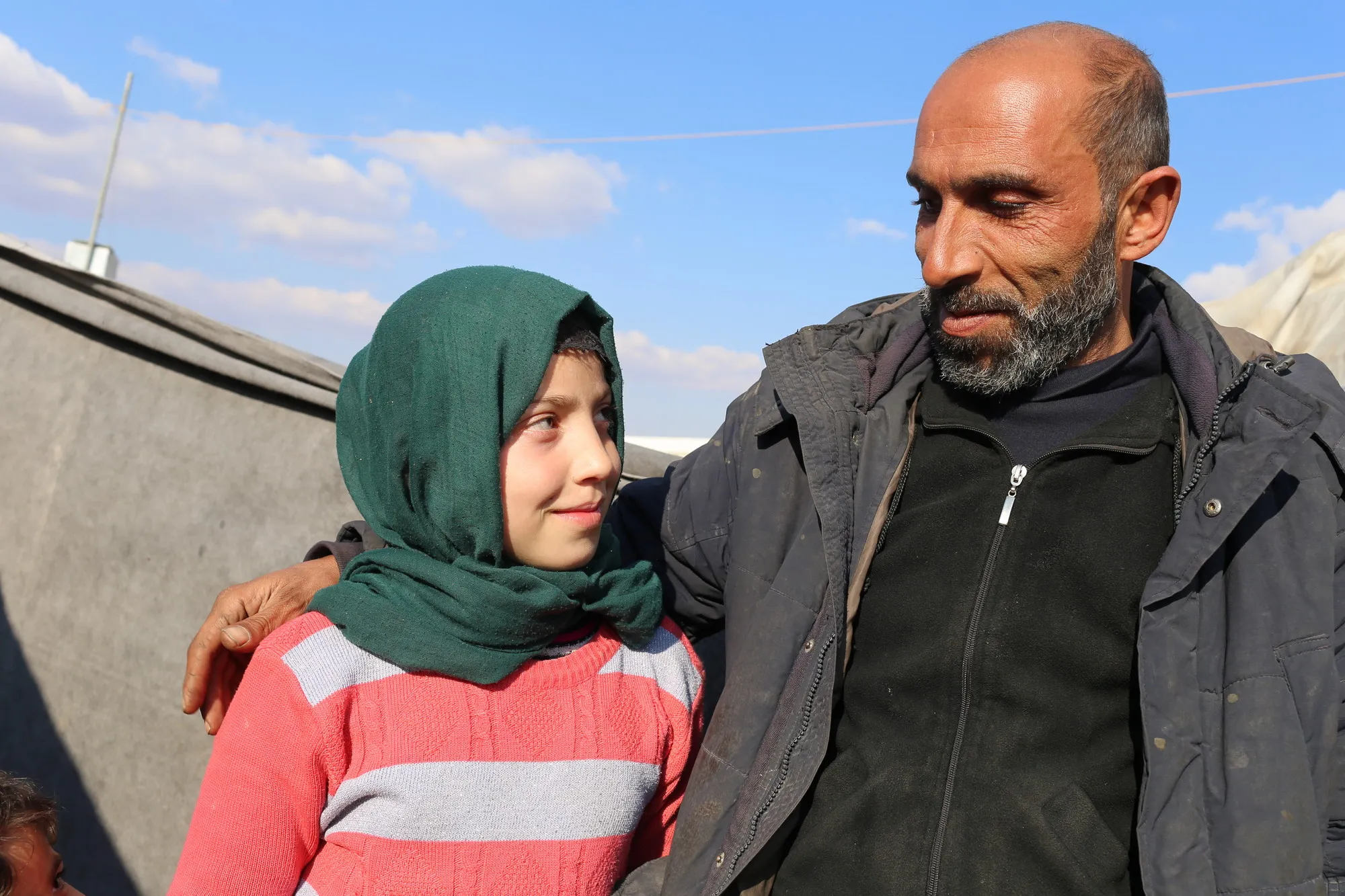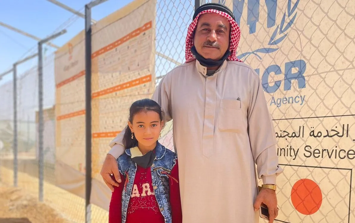 Habiba and her father Khaled at Azraq Camp, Jordan. Photo: CARE/Suhaib Al Jizawi