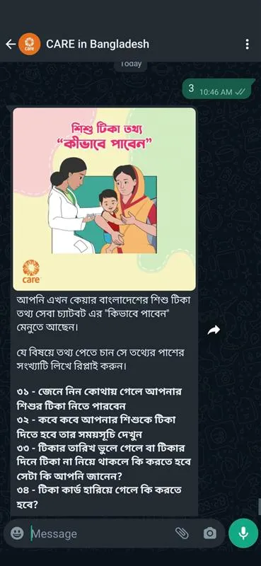 CARE Bangladesh—with support from Meta—used Turn.io's user-friendly platform to build a chatbot on WhatsApp that would provide people in Bangladesh with immunization knowledge.