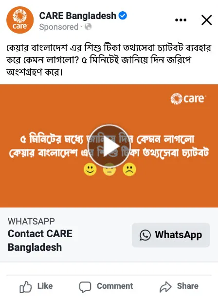 From December 2022 to January 2023, CARE Bangladesh launched and promoted their chatbot through a Facebook ad campaign, following months of content development, testing, and chatbot building through Turn.io’s user-friendly platform.