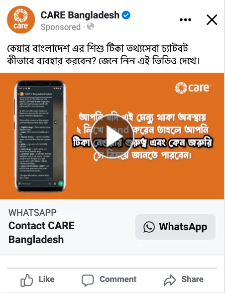 • CARE, with support from Meta, built an automated chatbot through Turn.io that delivered important early childhood immunization information to people in Bangladesh. The chatbot’s visibility was boosted by a Facebook ad campaign that ran from December 2022 to January 2023.