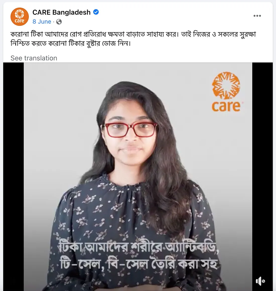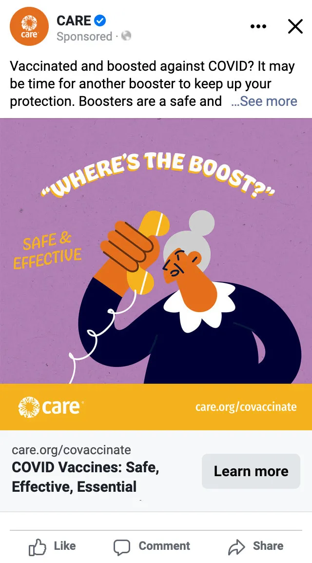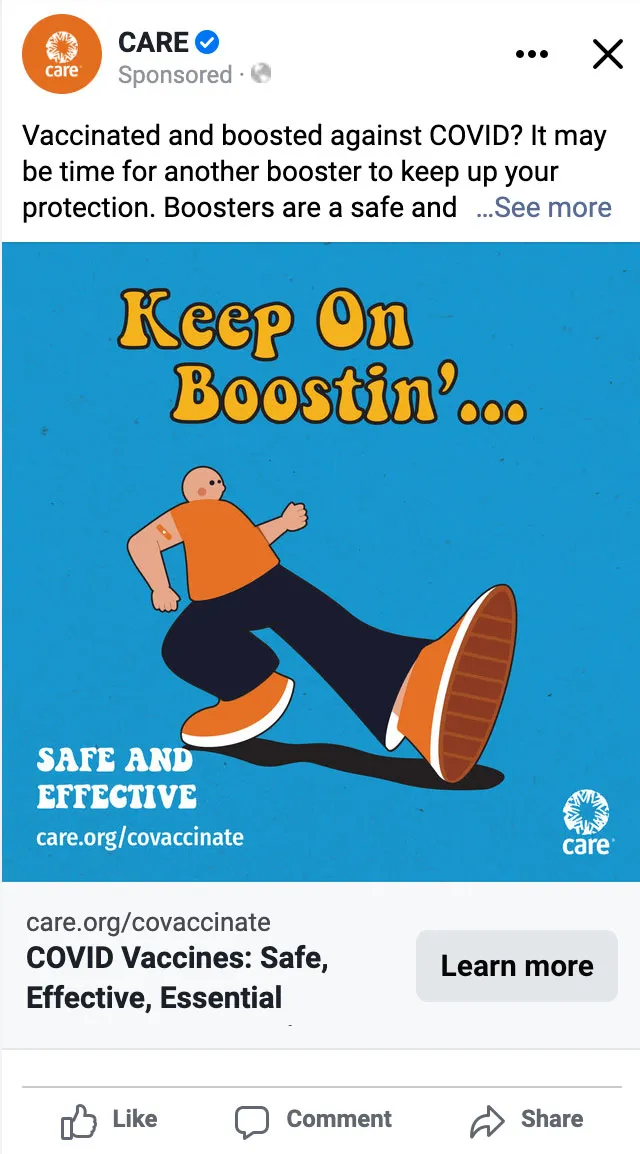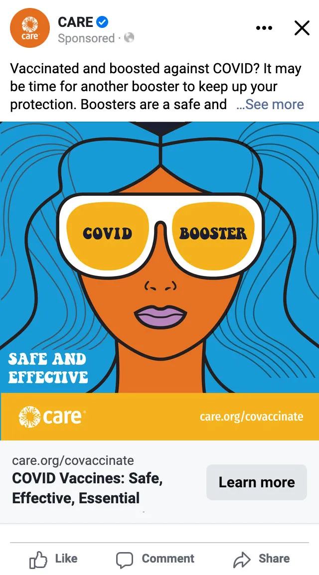 CARE Pakistan’s infographic-style creatives helped visualize what full vaccination entails: “first dose + second dose + first booster + second booster.” The CARE Pakistan team ran CARE’s most interactive ad campaign in this series with 2 million post engagements. Pakistan’s click-through rate (0.35%) was 75% above CARE’s benchmark and above what the country office’s previous campaign achieved in 2021.