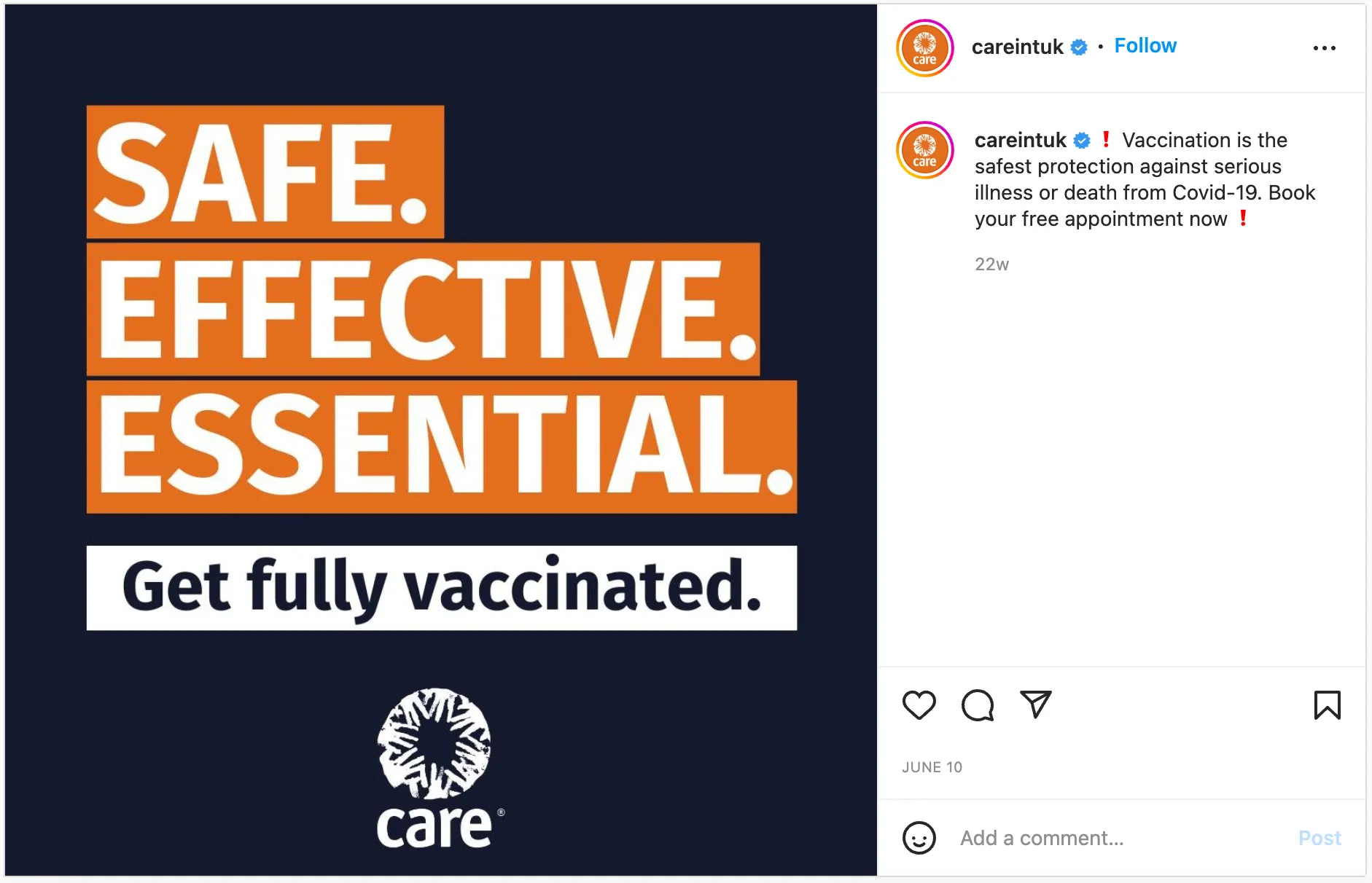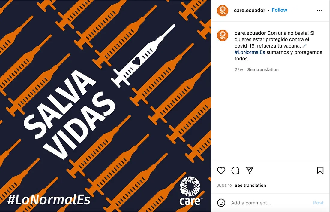 More than two years into the COVID-19 pandemic, the virus continues to spread through our global communities with ever-evolving variants that threaten our health, education, and livelihoods. Continuing CARE’s long-standing work in public health and expanding upon our formative social and behavioral change communication (SBCC) campaigns launched in 2021 in partnership with Meta, CARE ran a series of summer campaigns that promoted vaccine confidence and preventive practices in 16 countries across the globe.