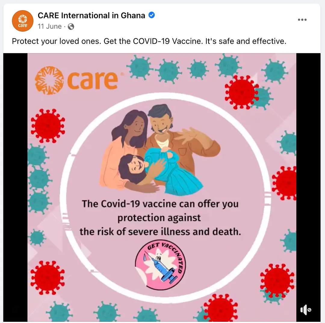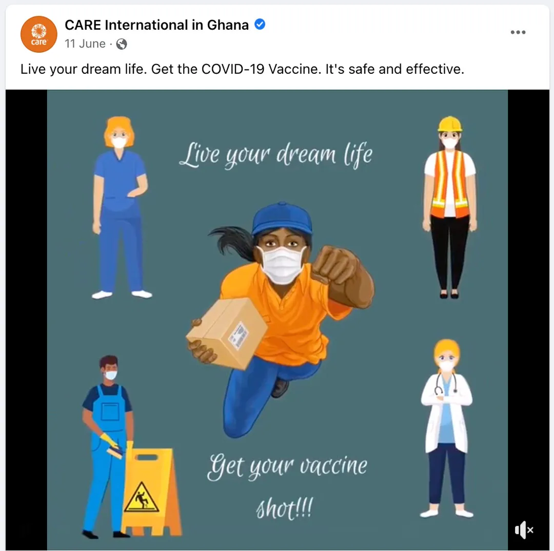CARE Ghana’s top performing creatives included two highly popular animated videos that emphasized protection of loved ones and personal freedom afforded by the COVID-19 vaccine.