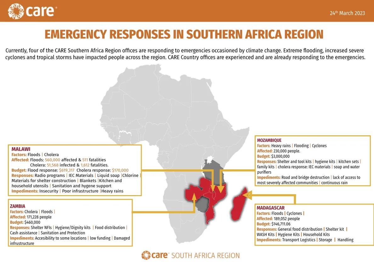 Laura: CARE Malawi distributed Water, Sanitation, and Hygiene kits [WASH] which is a priority, especially as the country is facing a cholera outbreak and cyclones and floods pose an additional risk for the spread of this disease. There are larger WASH kits delivered to entire communities and smaller kits delivered to households. These kits contain buckets, chlorine, hand soap, laundry soap, toothbrushes, and toothpaste.