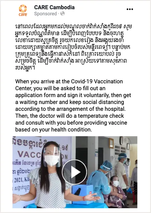 CARE Cambodia created videos explaining what to expect when arriving for a vaccine appointment.