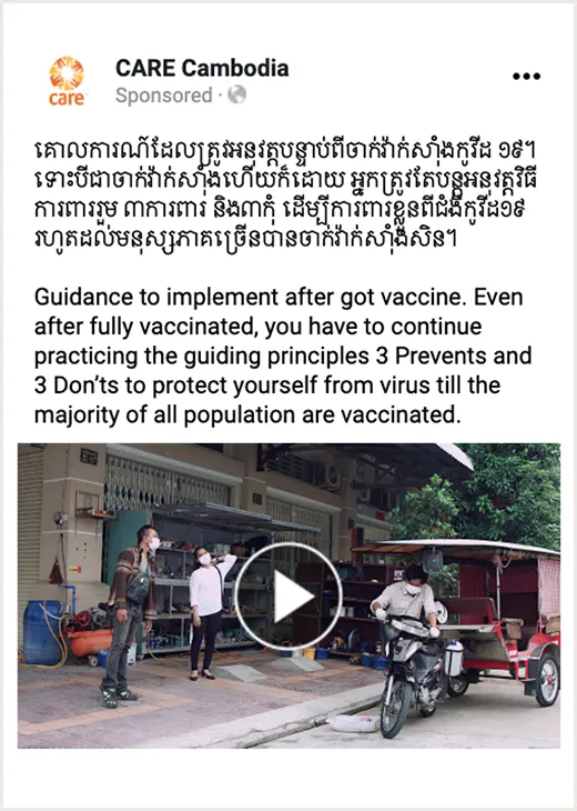 Several countries identified the need to help parents talk to their children about COVID and the importance of preventative behaviors. Both CARE Cambodia and CARE Somalia created this kind of messaging for parents. Each team created fun, animated videos that were their top performing posts. These posts also enjoyed the most Facebook saves, a rare, high impact behavior seen on Facebook. Somalia’s video featured a celebrity singer who created a song about COVID prevention.