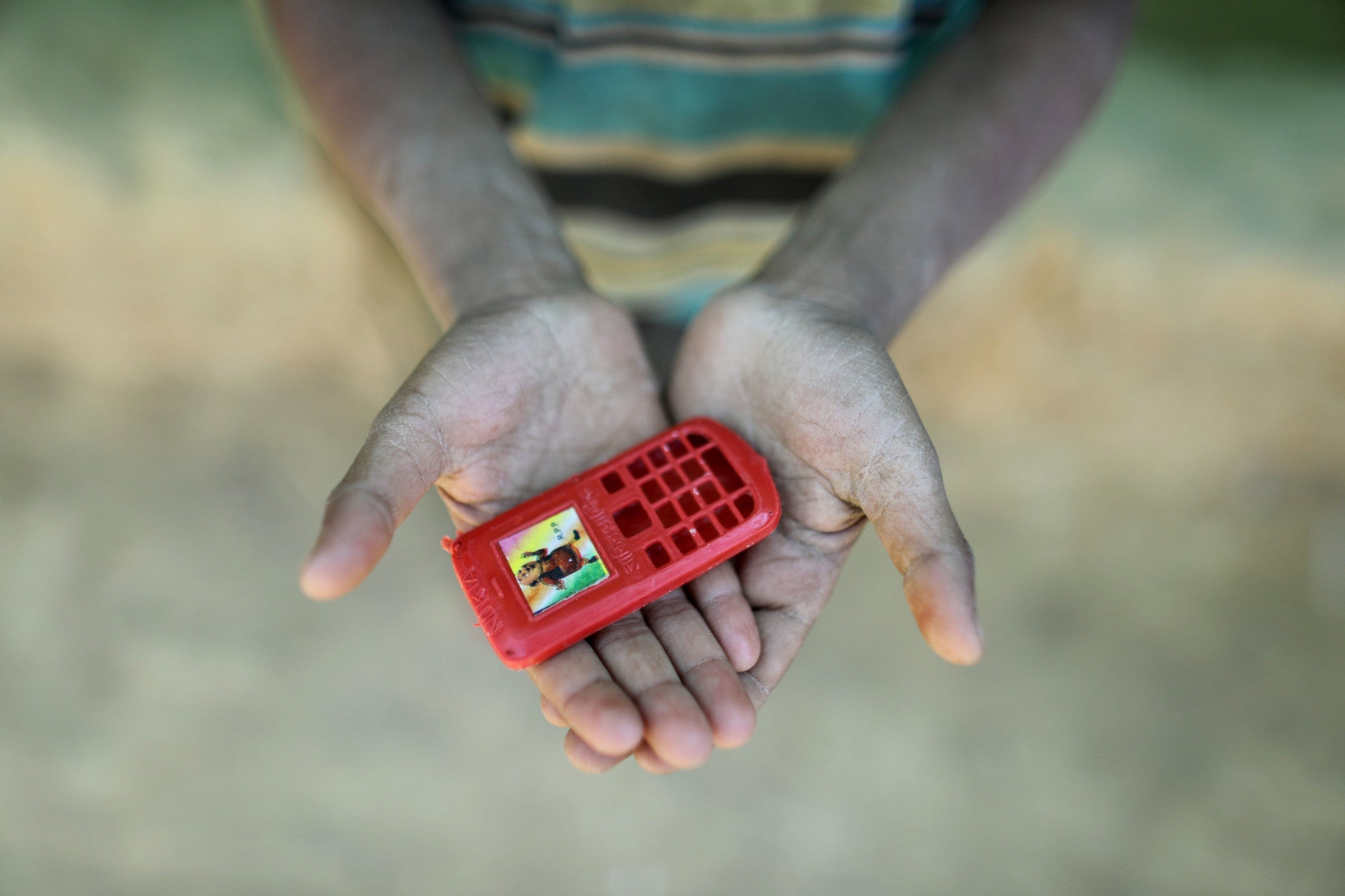 Mohammad found this plastic phone in a snack box he received. The 10-year-old fled Myanmar after his home was burned down. One day he wants to have a real phone to call his friends.