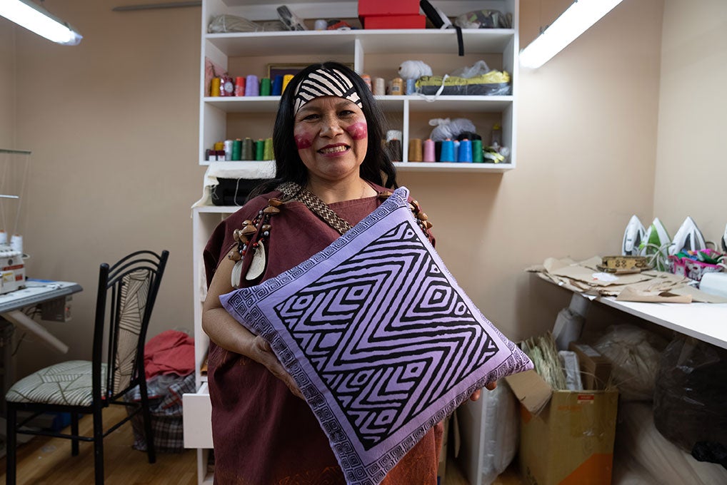 Forty-six-year-old Mery Neli Salazar Pedro has been running her family’s artisan business, Arte Yanesha Amazónica, from her home in Peru for ten years. Her husband, three of their five children, and three other women work in the business. They produce clothing, accessories, and homewares, all with Amazonian designs.