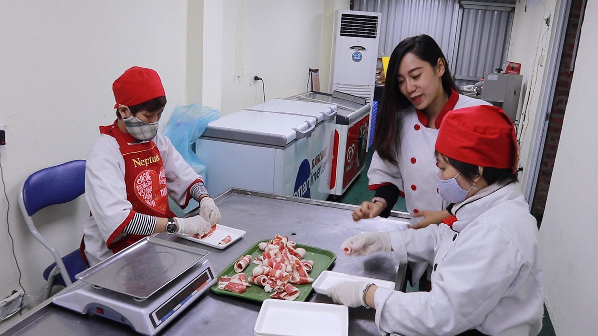 A Vietnamese woman wearing a white and red chef's apron speaks to two food workers, both wearing red hats and blue masks, while they prepare meat.