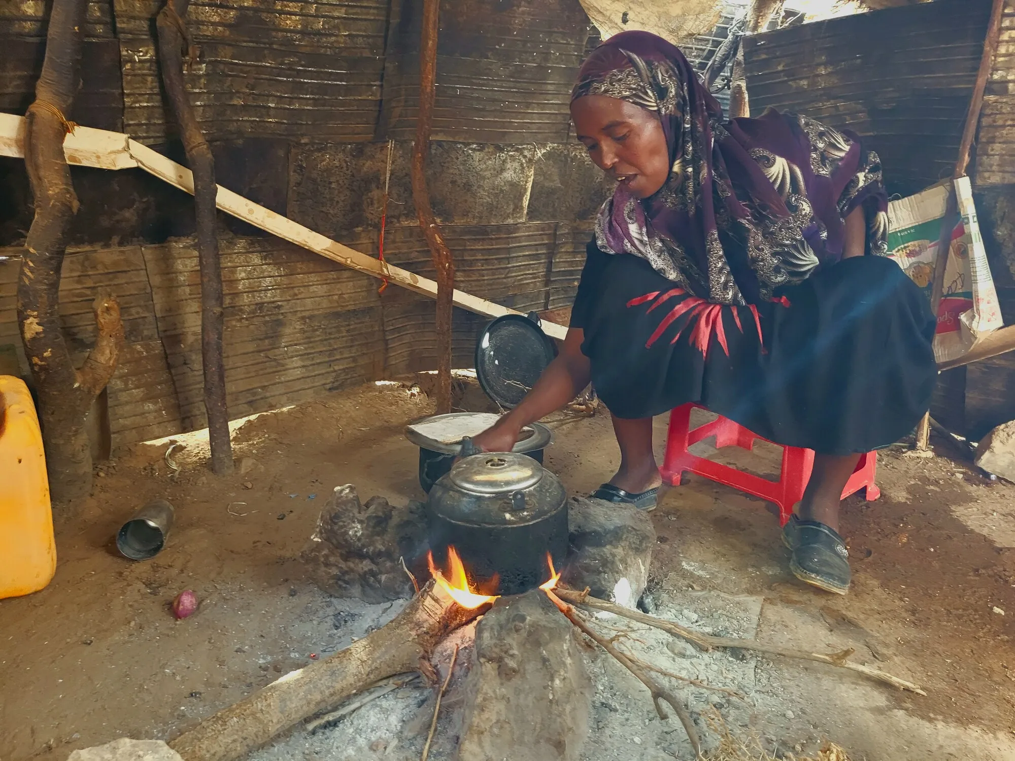 Sitting on a small stool, she lights a fire and then places a cooking pot on it. They often have to skip a meal because they do not have enough water. “I cannot cook for my children without water,” explains Asha.