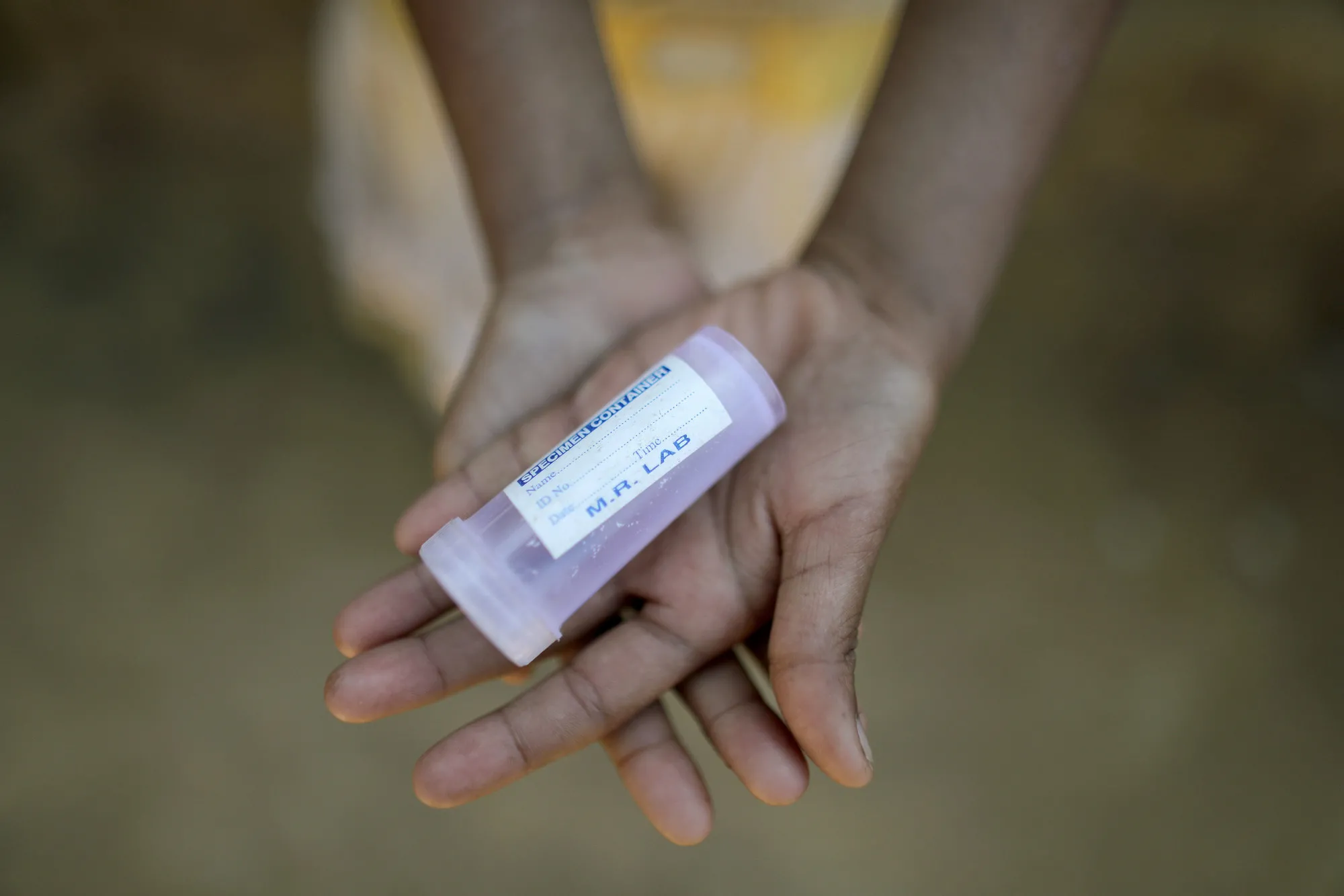 Rokhaida, 8, carries an empty medical container. At the camp in Bangladesh, many of the Rohingya refugees are sick and in desperate need of medical services.