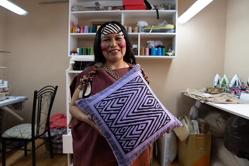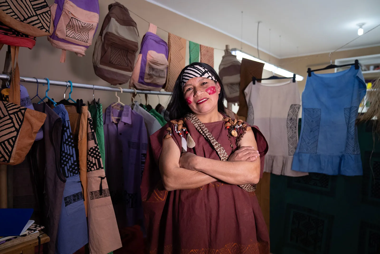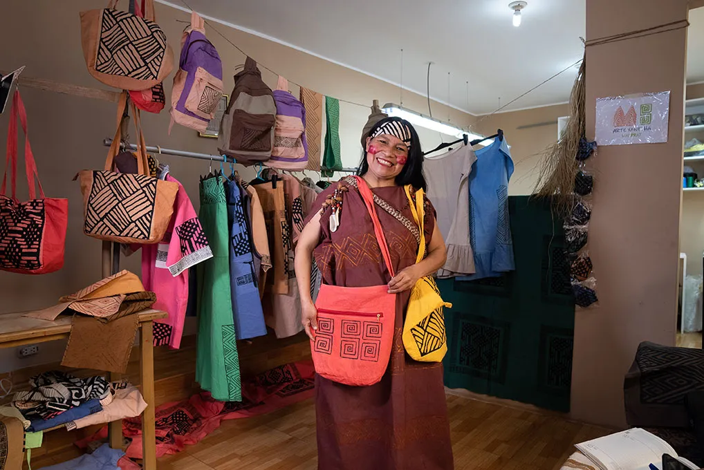 Forty-six-year-old Mery Neli Salazar Pedro has been running her family’s artisan business, Arte Yanesha Amazónica, from her home in Peru for ten years. Her husband, three of their five children, and three other women work in the business. They produce clothing, accessories, and homewares, all with Amazonian designs.