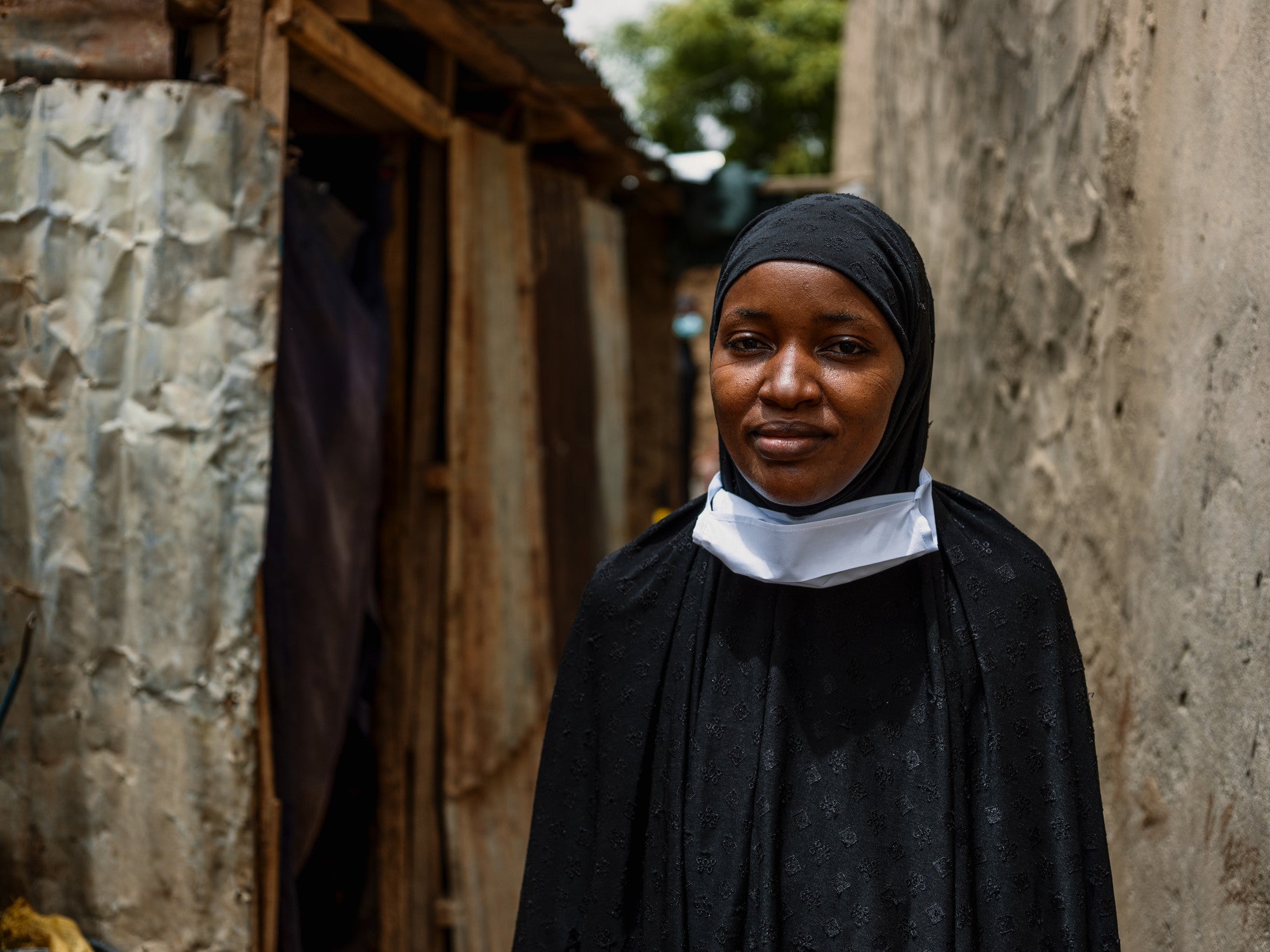 A woman in Niger stands in between a concrete wall and a house made of corrugated metal and wood.