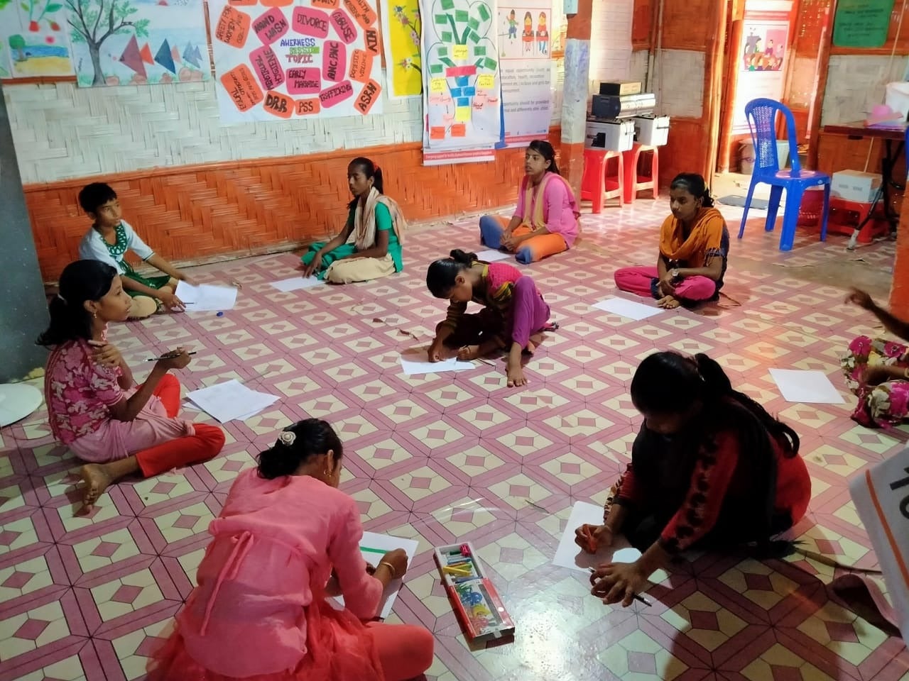 Girls participate in a drawing session at the Women and Girls’ safe space in Cox’s Bazar refugee camp, Bangladesh, while maintaining social distance. The majority of refugees in Cox’s Bazar — approximately 459,000 — is children. About 51% are women and girls.