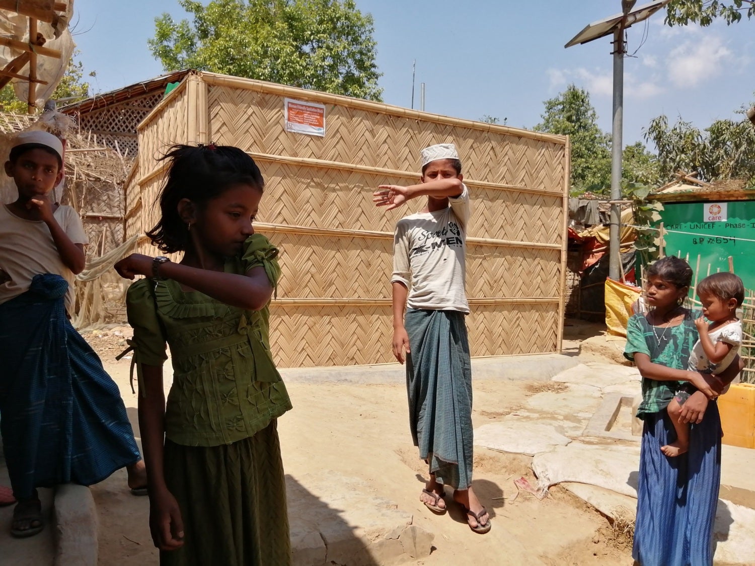 Children in Cox’s Bazaar, Bangladesh, home to the world’s largest refugee camp, participate in a CARE workshop on coughing and sneeze etiquette.