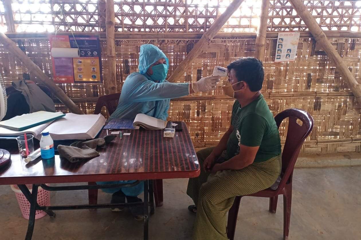 A health worker wearing personal protective equipment (PPE) provides treatment to a patient in Cox’s Bazar, Bangladesh. Health services are limited and there are no intensive care beds in the camp.