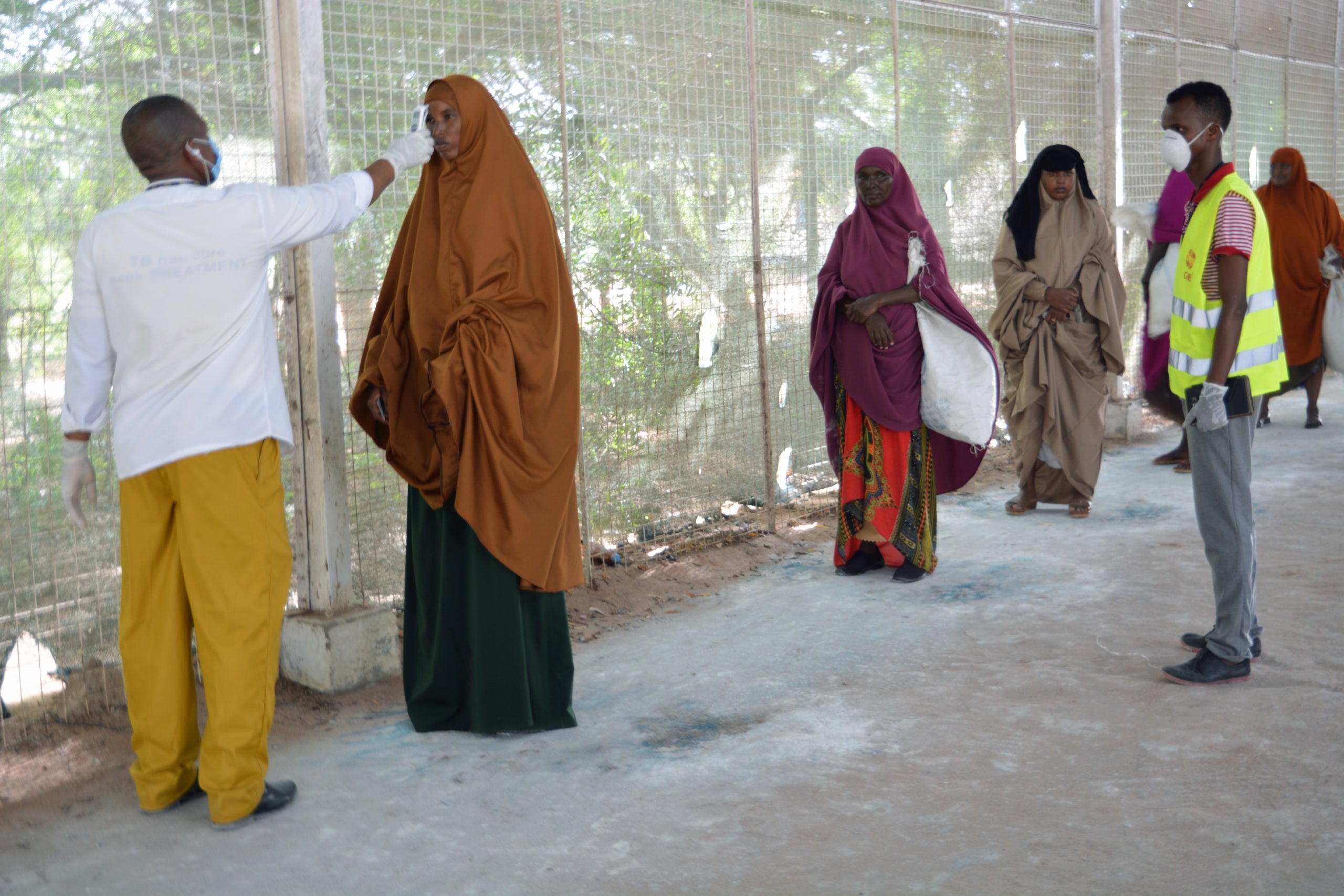 Women line up to have their temperature checked while maintaining social distance in Kenya’s Dadaab refugee complex. The camps in Dadaab are home to over 230,000 refugees.