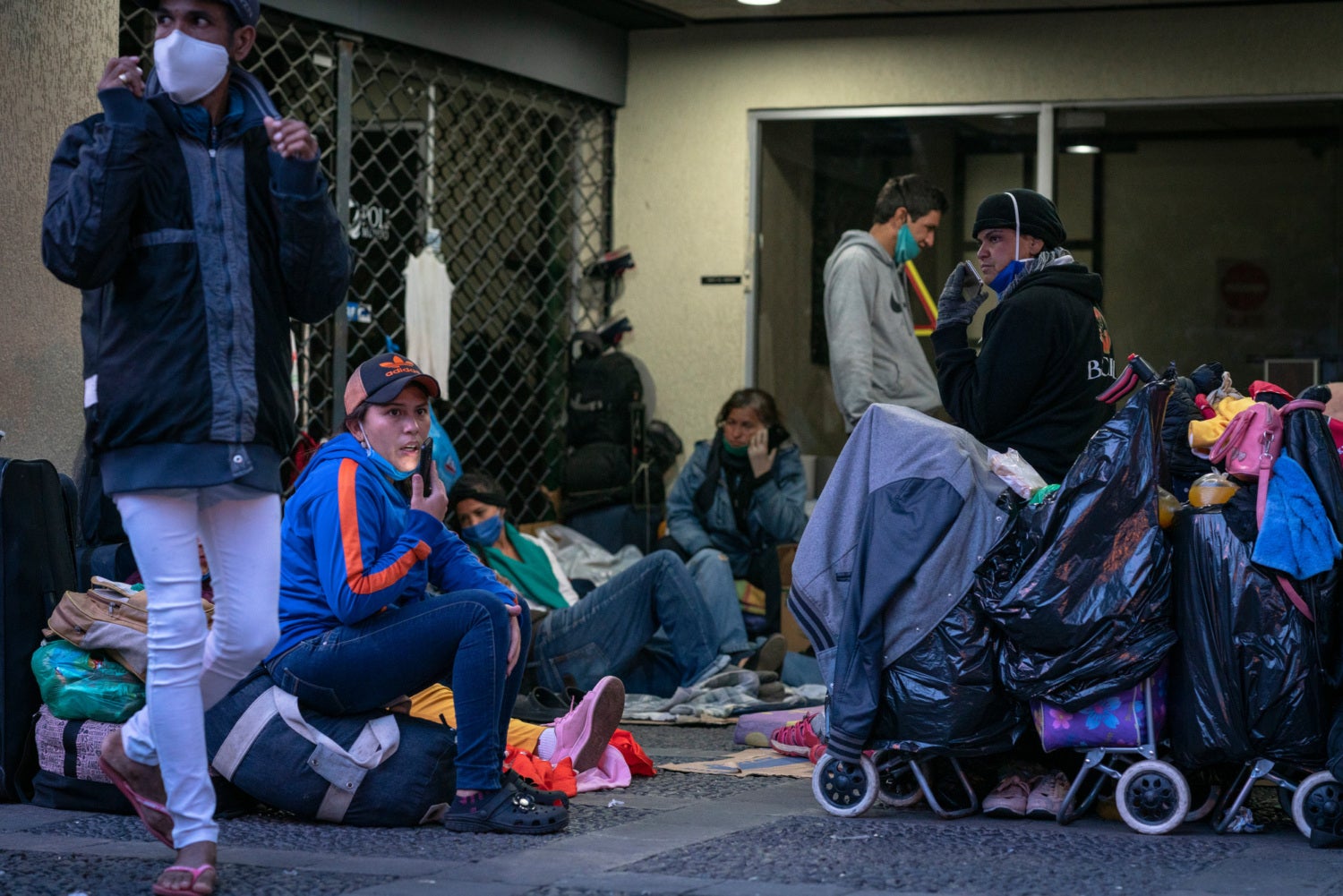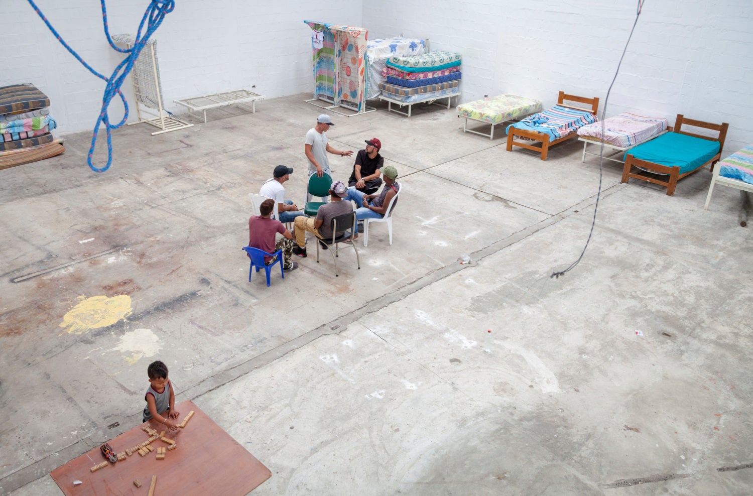 A group of Venezuelan migrants gather in a shelter in Quito, Ecuador, while a child plays nearby with blocks. They have been in isolation together for more than three weeks and are waiting for Venezuela to lift its suspension of evacuation flights so that they can return home.