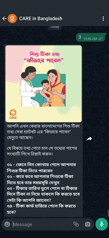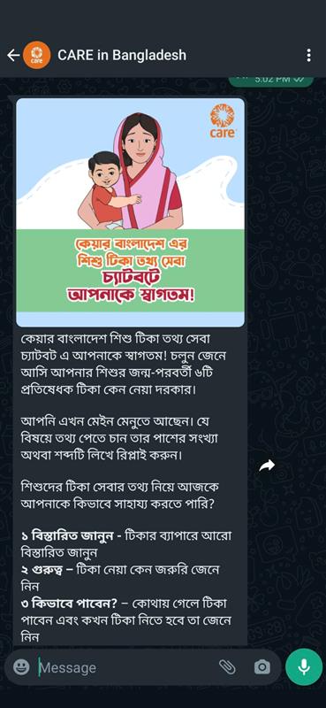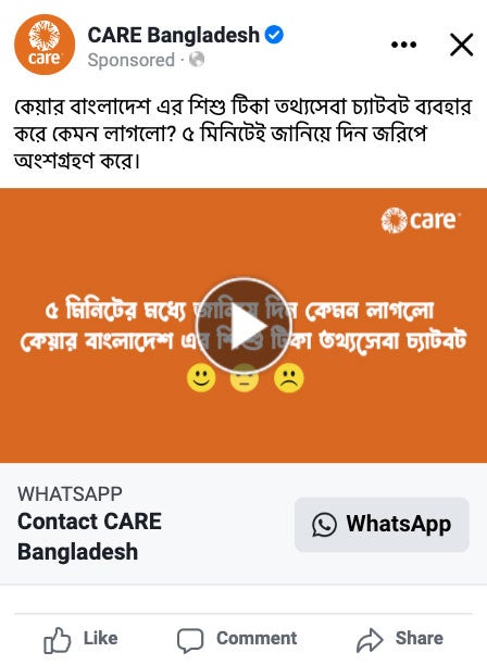 - CARE, with support from Meta, built an automated chatbot through Turn.io that delivered important early childhood immunization information to people in Bangladesh. The chatbot’s visibility was boosted by a Facebook ad campaign that ran from December 2022 to January 2023.