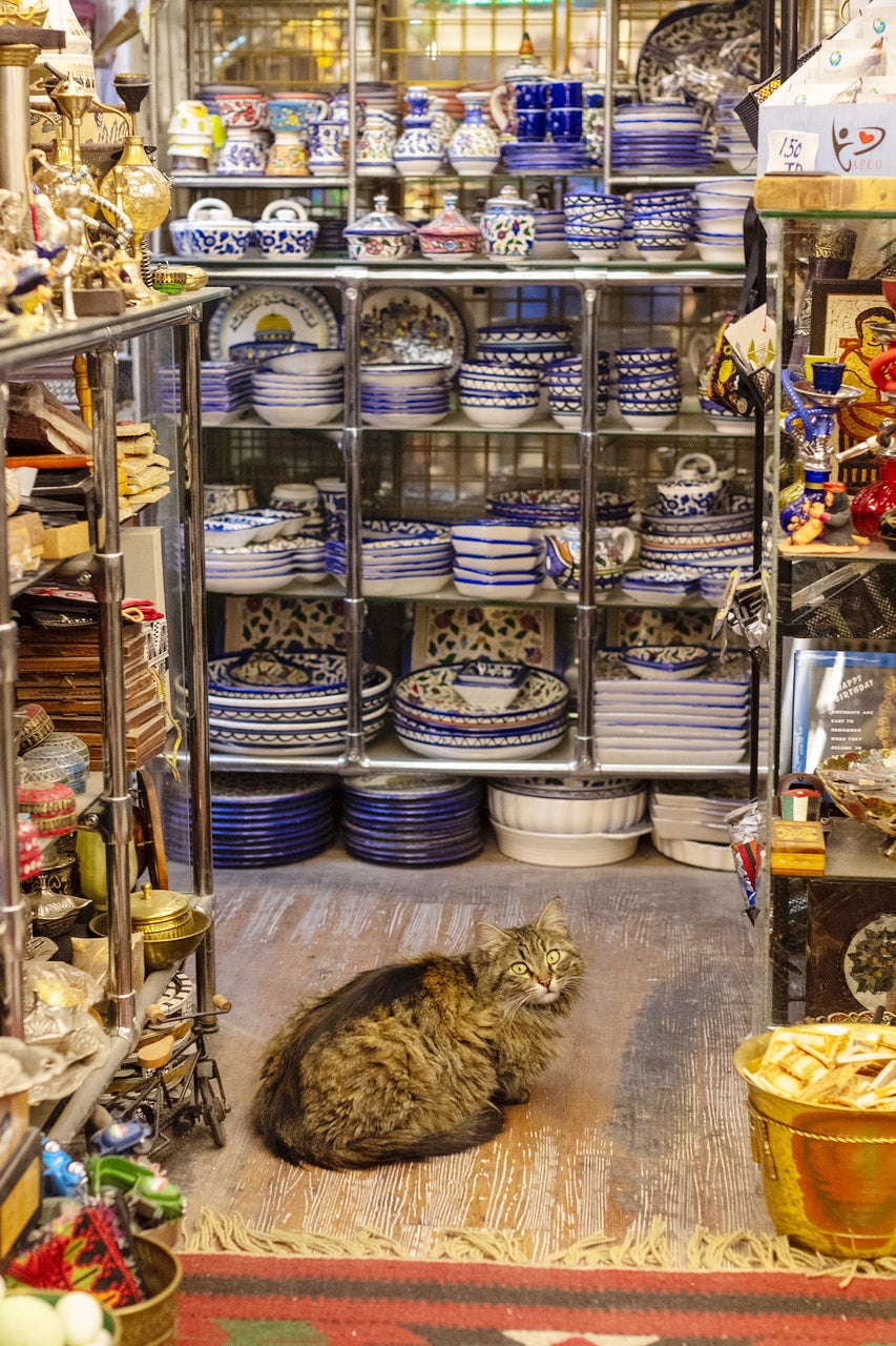 A shop cat makes herself at home in a souvenir store in Amman, Jordan in 2019. Photo: Laura Noel/CARE