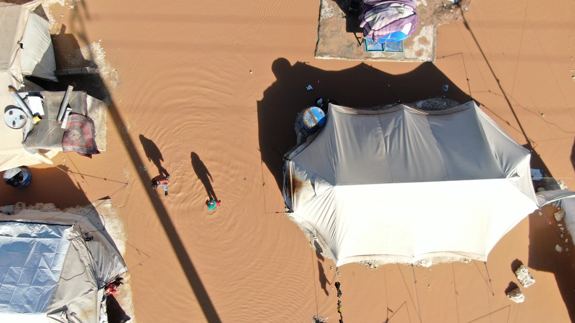 The storm has turned camps into lakes.