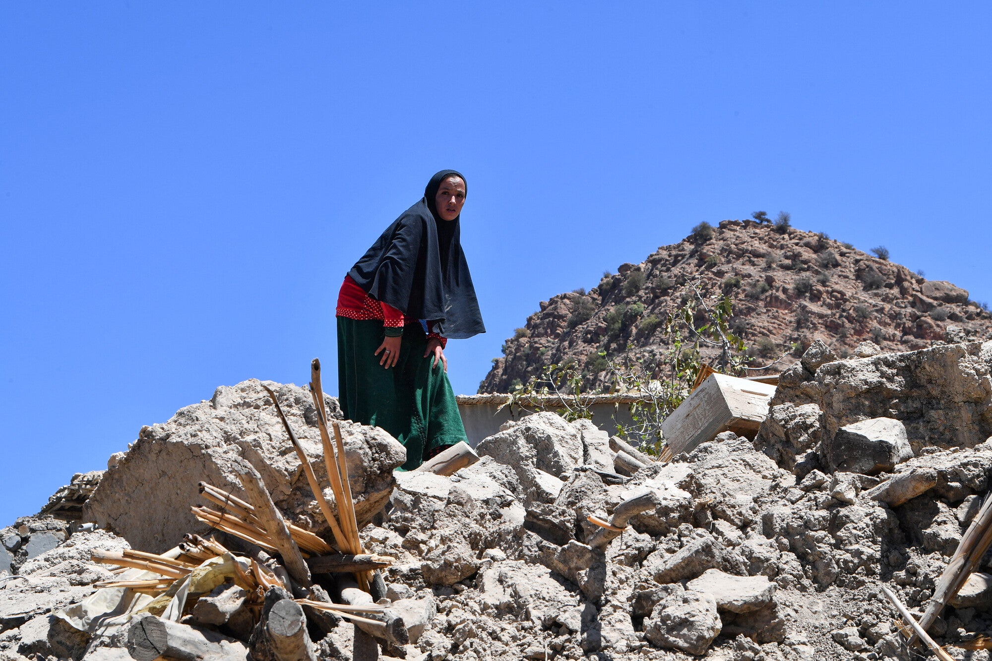 A woman searches through the rubble of a home in Imoulass village of the Taroudant province, one of the most devastated in quake-hit Morocco. Photo: Fethi Belaid / AFP