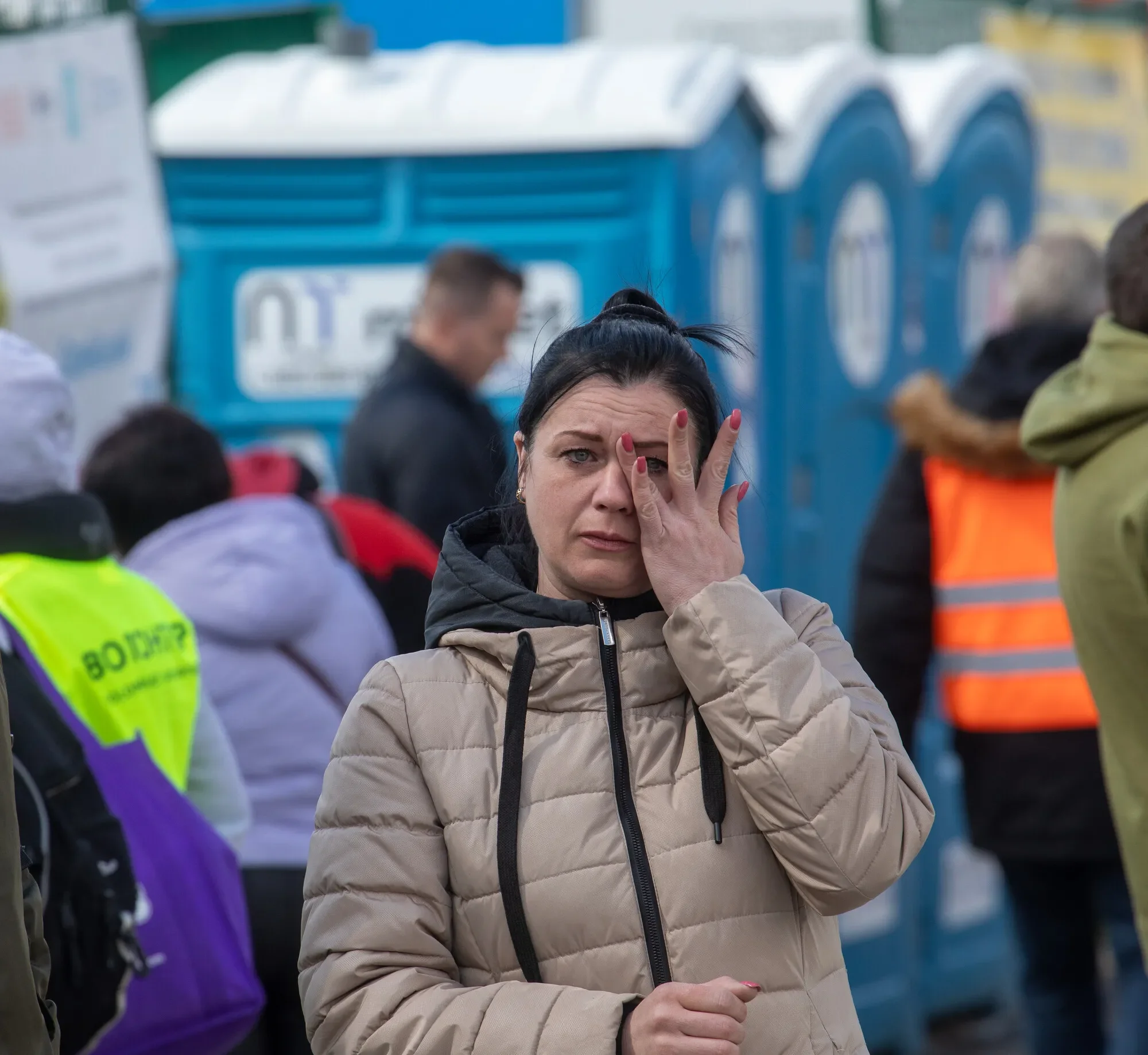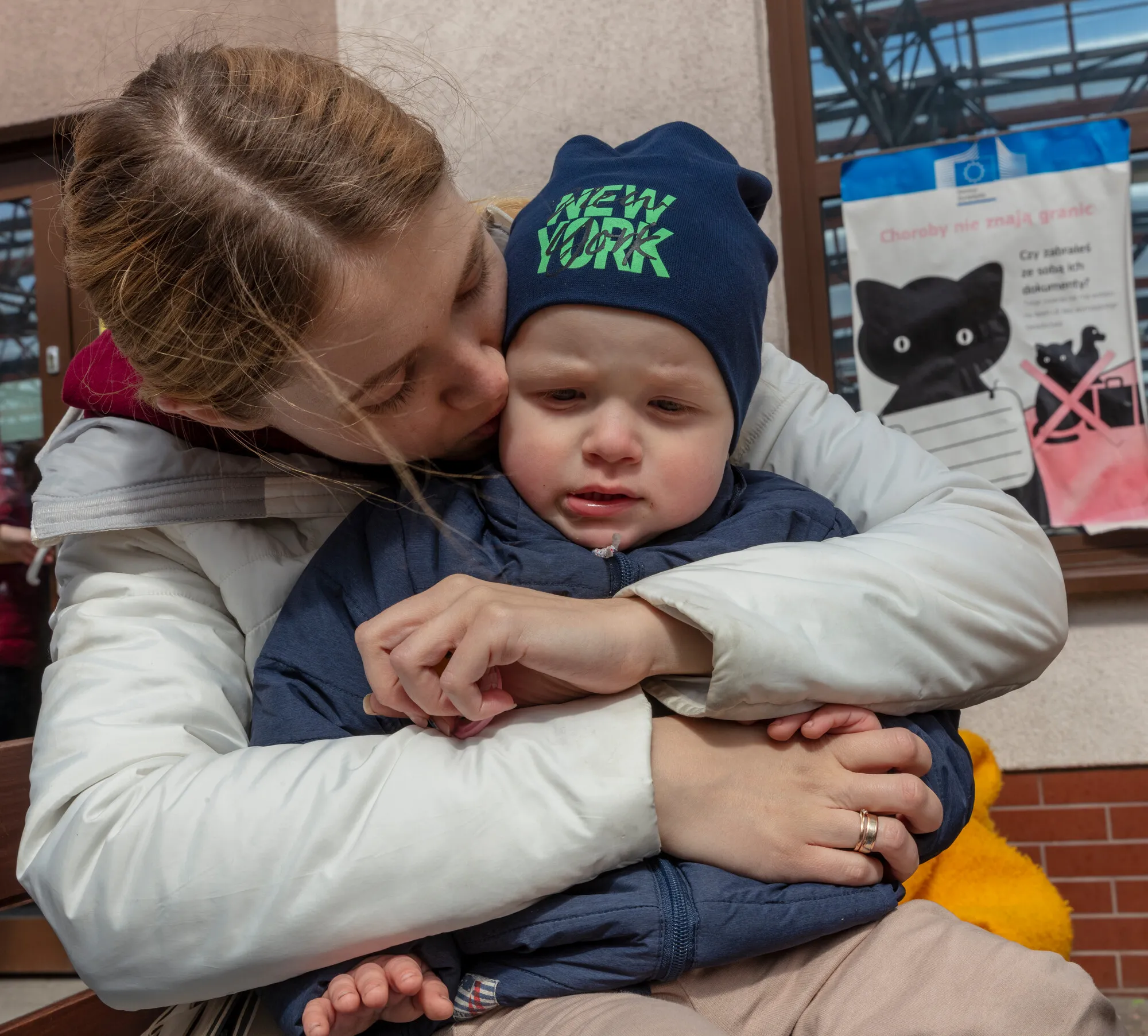 Ukrainian refugee Marina embraces her daughter, Arina, moments after passing through border control into Poland near the town of Hrebenne. Mother and daughter were fleeing the Sumy region in Northwest Ukraine. CARE is working with our partners Polish Humanitarian Action (PAH) at the border and elsewhere to provide food, water, clothing and other necessities to refugees.