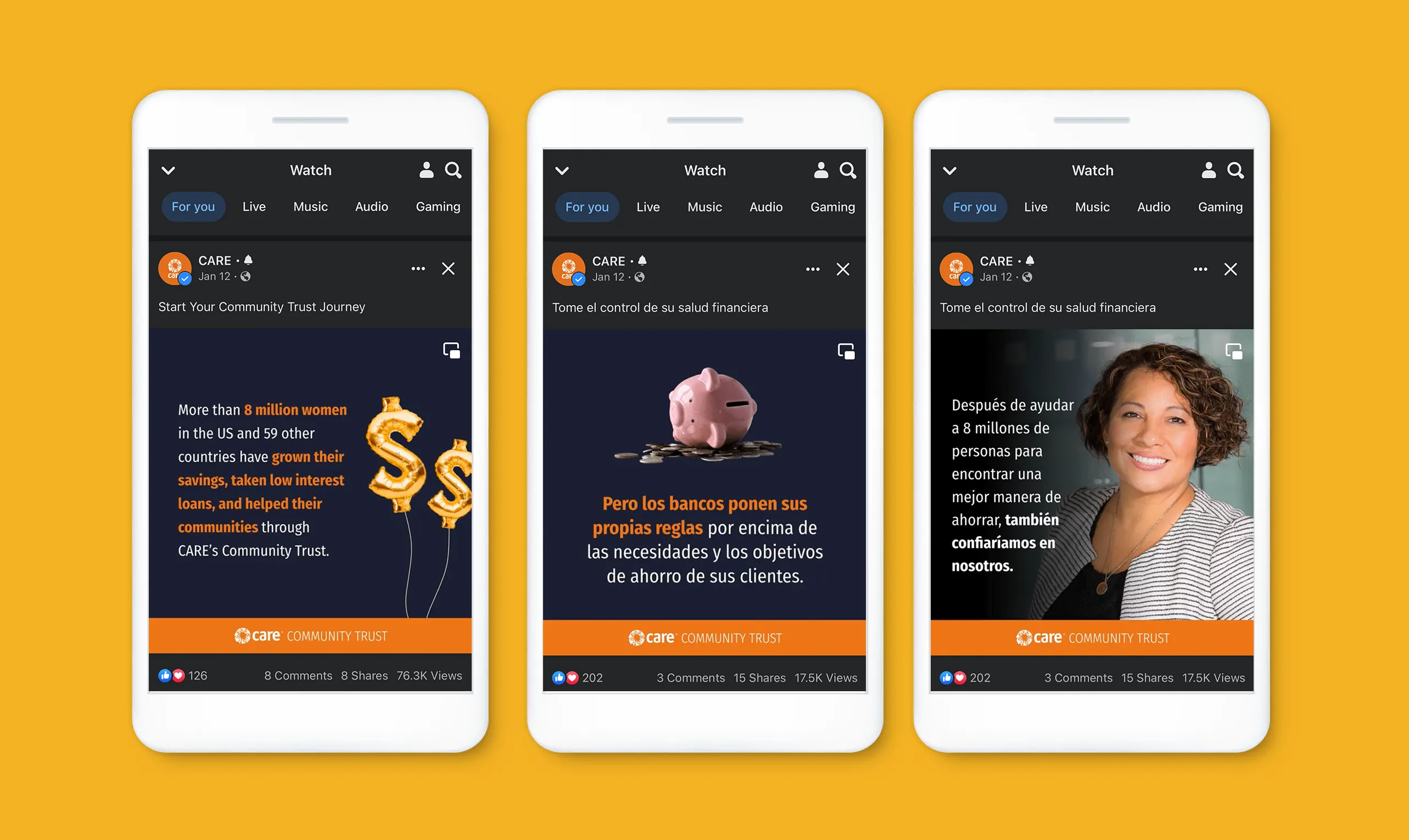 To test this, CARE created a series of different campaign ads focused on increasing women’s belief that Community Trusts could help them build the financial skills and a supportive network to access financial freedom. Key messages communicated three key themes: building financial skills; acquiring a supportive network; and accessing financial freedom. The ads incorporated statistics, testimonials and coaching intended to boost awareness of and trust in the CARE Community Trust brand and underscore the value-add of these groups over other savings mechanisms that exist in target communities. Our ads ran in English in Atlanta and Houston and in Spanish in Los Angeles.