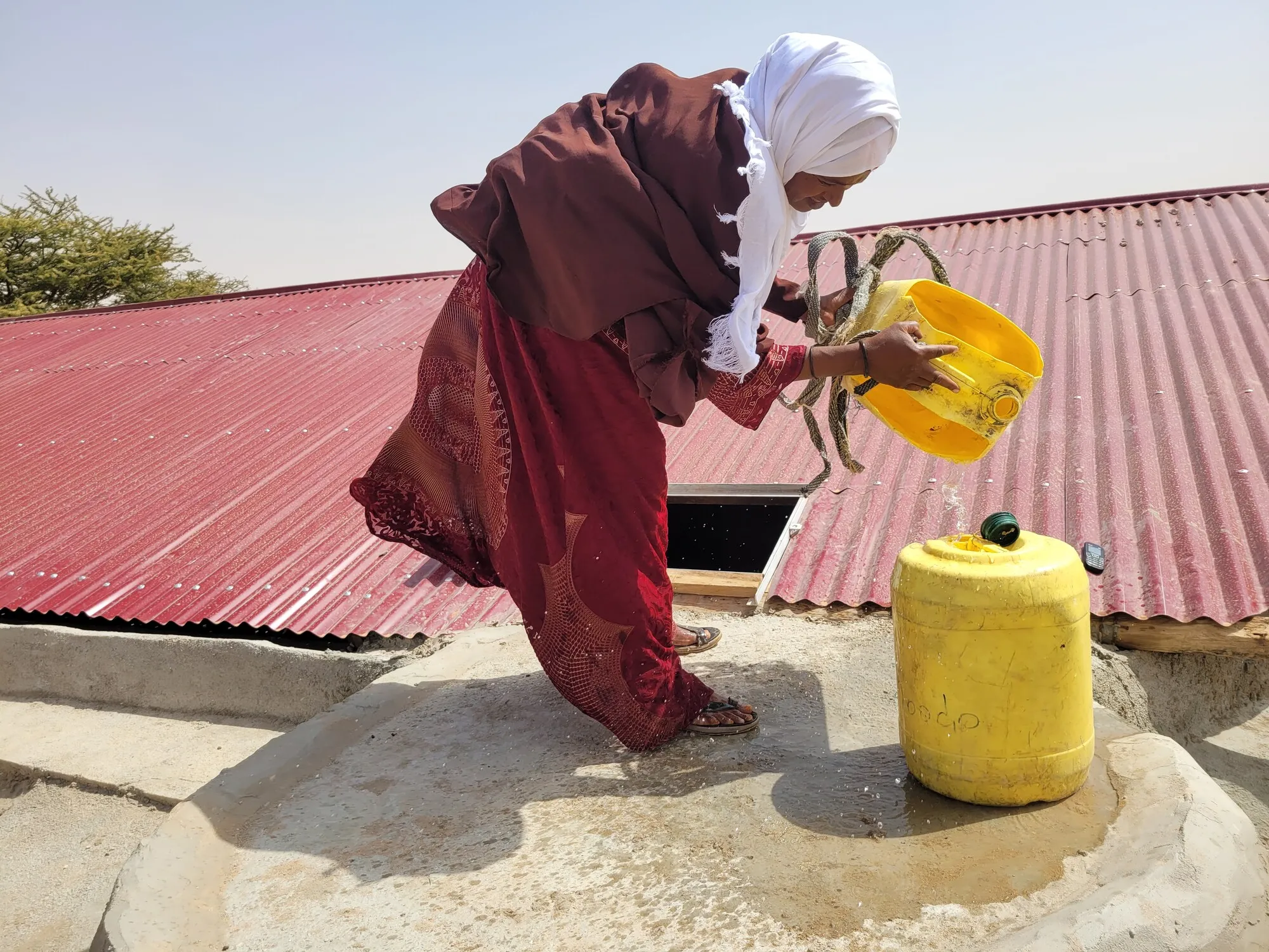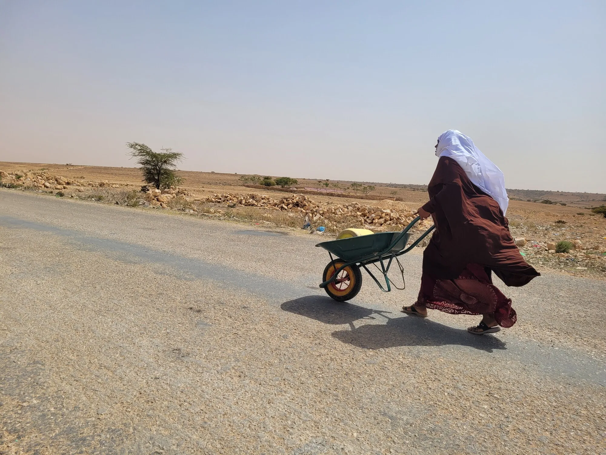 She uses a wheelbarrow to move a large water canister across the dry ground to the water tank. As she does so, the wind whirls up the sand. One water delivery can supply about 2,000 people for a week; animals and fields receive nothing.