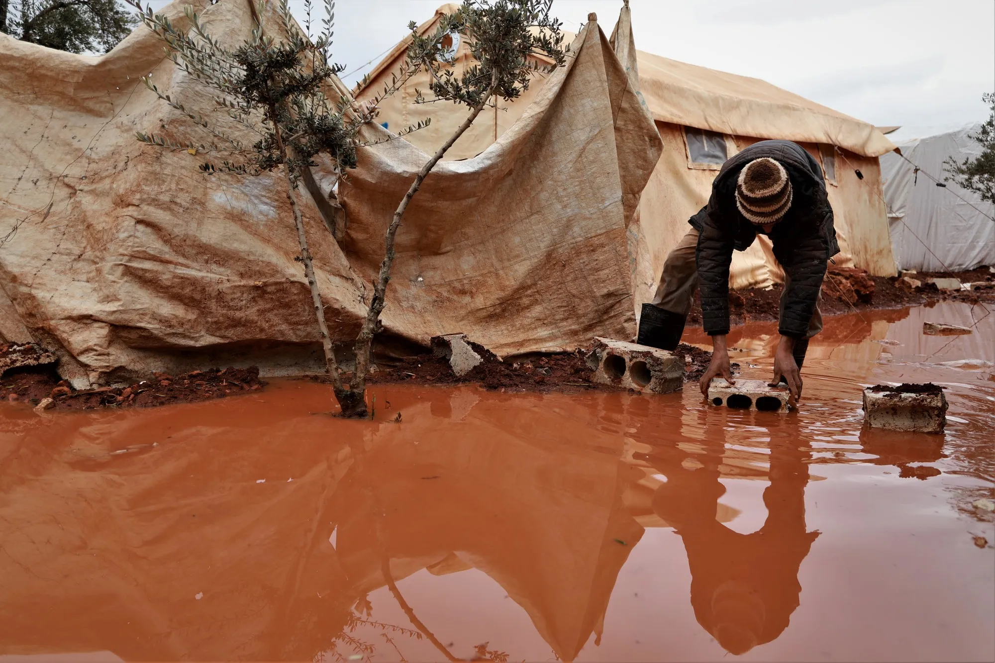 More than 22,000 displaced people have lost their temporary homes as heavy rains, flooding, and snow damages and destroys over 4,000 tents at displacement camps in northwest Syria. One child has died, and three other people were injured as a result of the harsh weather conditions.