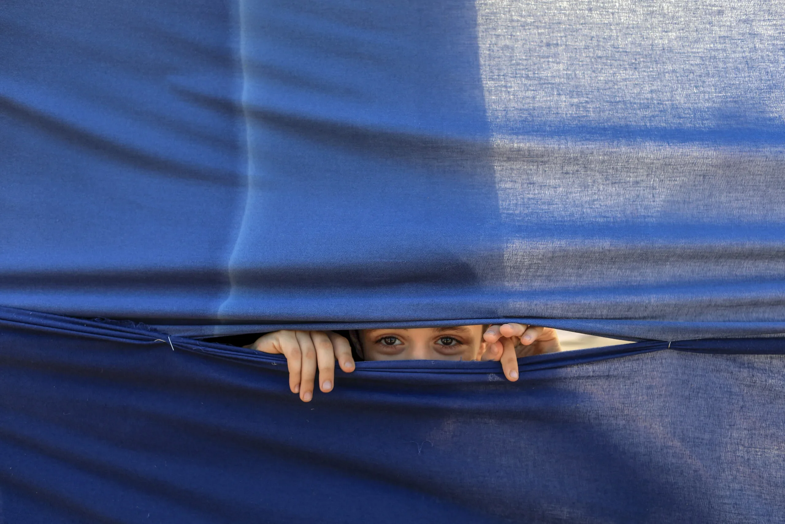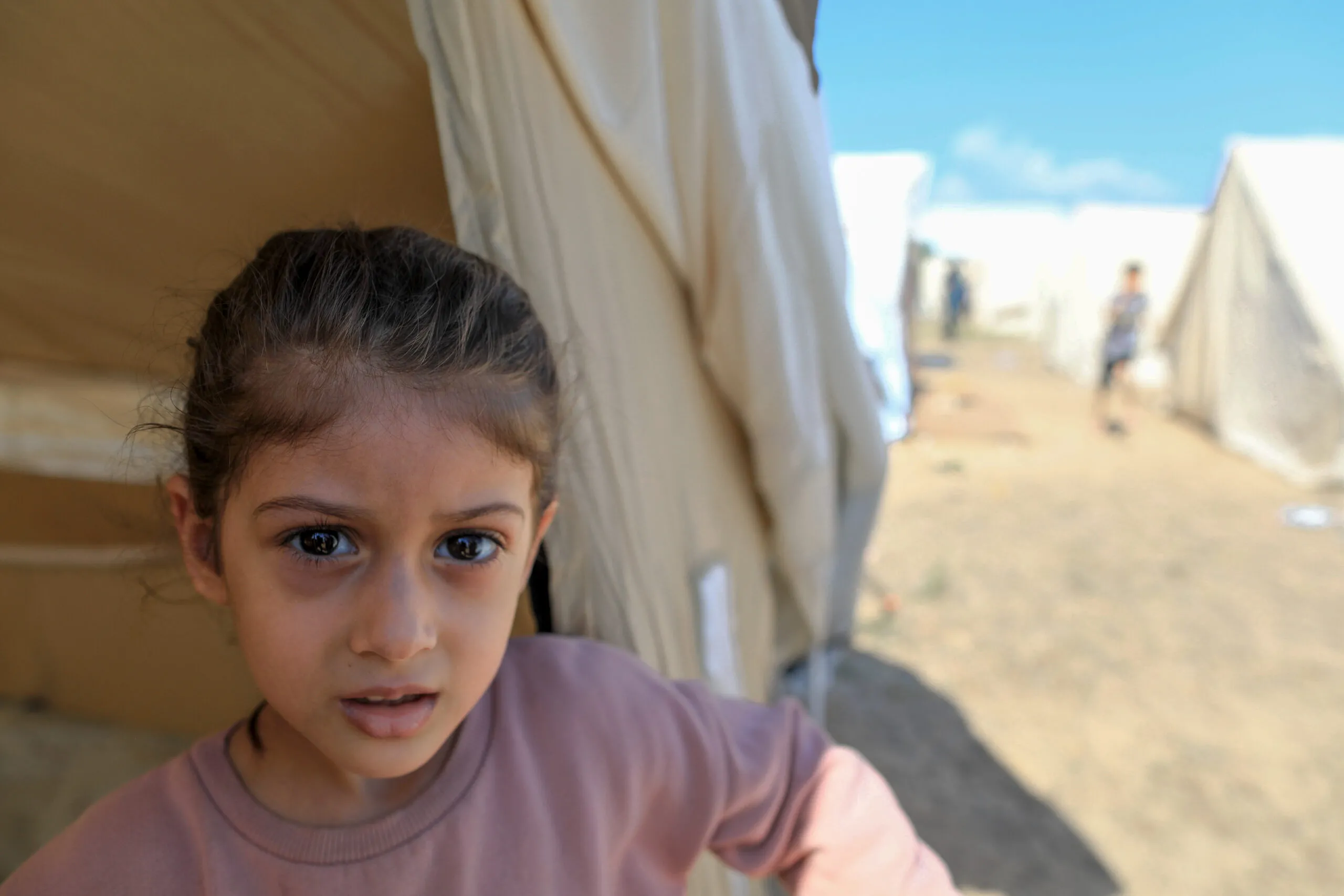 A Palestinian child displaced by the Israeli bombardment of the Gaza Strip stands in a tent camp in Khan Younis, in southern Gaza. Photo: Grayscale Media/CARE