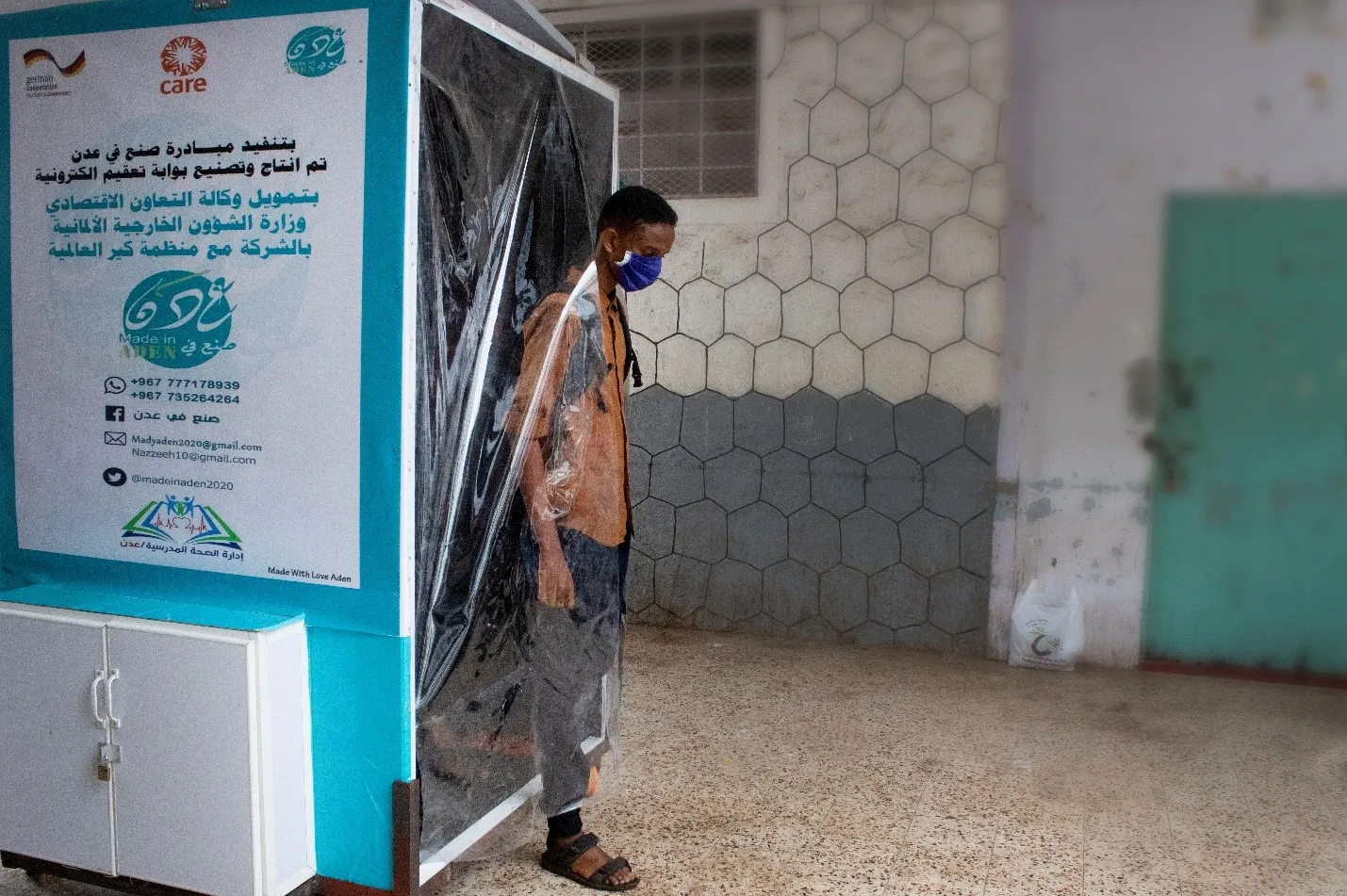 “I felt excited when I heard about CARE’s project. Thankfully we were selected to participate,” says Sami. “After the training, we received a financial grant of $3,093 to install one sanitizing gate at a Marib school in Al Mualla district and another gate at Khadiga school in Al Mansoora district. The two gates are a one-step solution meant to clean hands and clothes without wetting or staining them.”