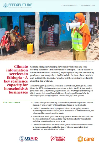 Climate change is wreaking havoc on livelihoods and food security outcomes in the lowlands of Ethiopia. Timely access to climate information services (CIS) can play a key role in enabling producers to manage their livelihoods in the face of uncertainty and mitigate the impact of shocks, but these systems are largely absent in the lowlands. This learning brief describes how CARE International, through the Mercy Corps-led RIPA-North program, is working to foster locally driven services for climate and early warning information. The brief highlights the impact this is having in terms of household-level decision-making and also the challenges of achieving long-term sustainability of these systems.